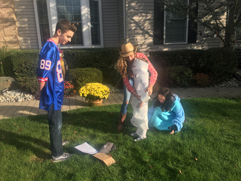 The competition was intense, with different strategies approached by each team. The baseball player, football player, cowgirl and Stitch got right to work on finding their items for the scavenger hunt while the other team decided to focus more of their time towards their video skit and composition. Both teams worked collaboratively together and most importantly everyone had a blast! After tallying up all the scores, Emily Dickinson, the werewolf and the baby won by just 5 points, receiving a total 87 out of 100 points. I also surveyed some impartial judges for the scarecrows, and the Wounded Pirate received the most votes. Both teams did an amazing job - I was totally impressed by the hard work and creativity that all the students possessed. Happy Halloween to all!